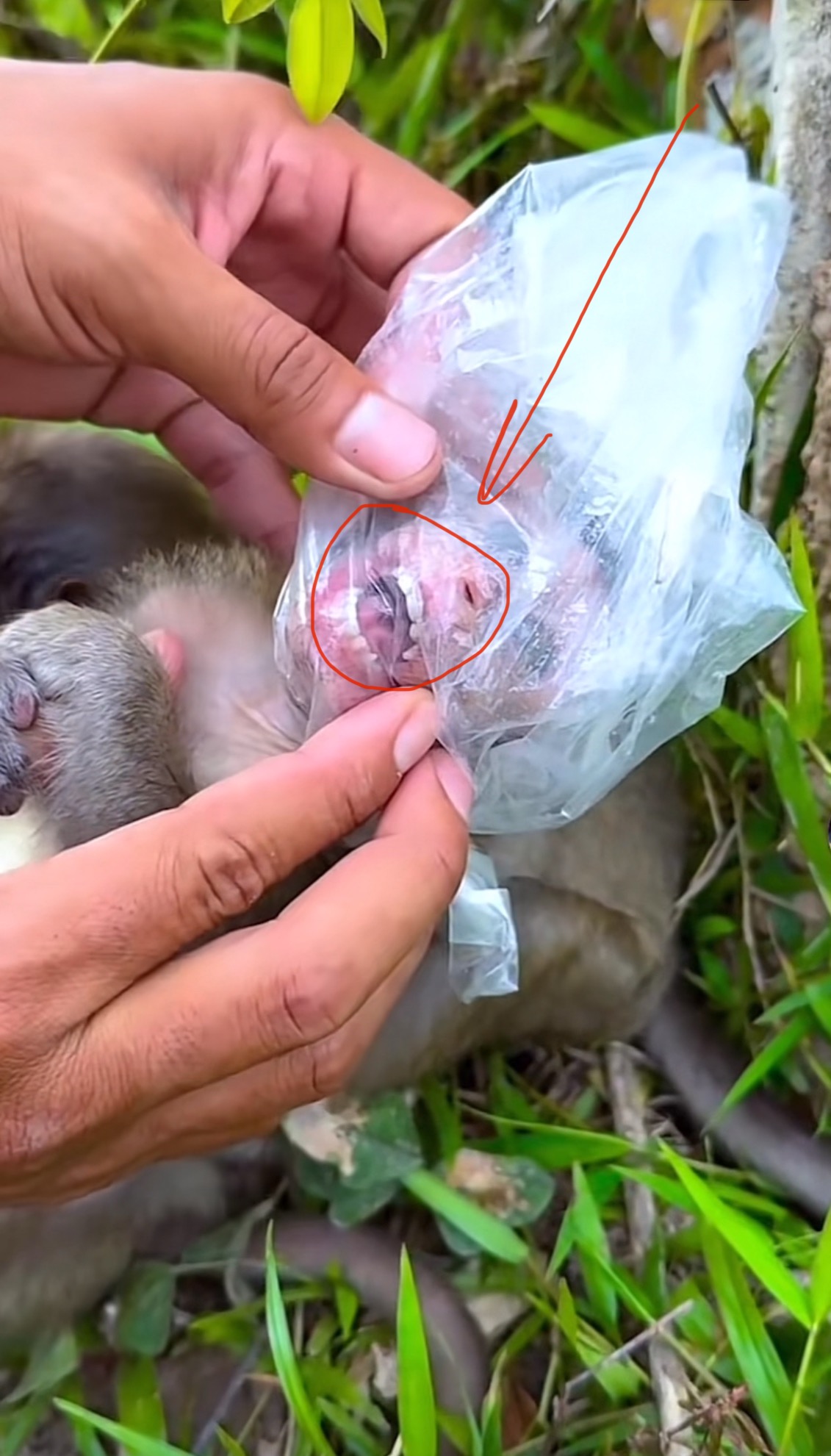 In a heartbreaking incident caught on camera in a small forested area near a village in Southeast Asia, a baby monkey was seen with its face trapped inside a plastic bag for over 10 minutes. The young animal, clearly distressed, was stumbling blindly, its tiny hands clawing at the suffocating plastic. Without intervention, this innocent creature could have died — another silent victim of humanity’s plastic pollution crisis.