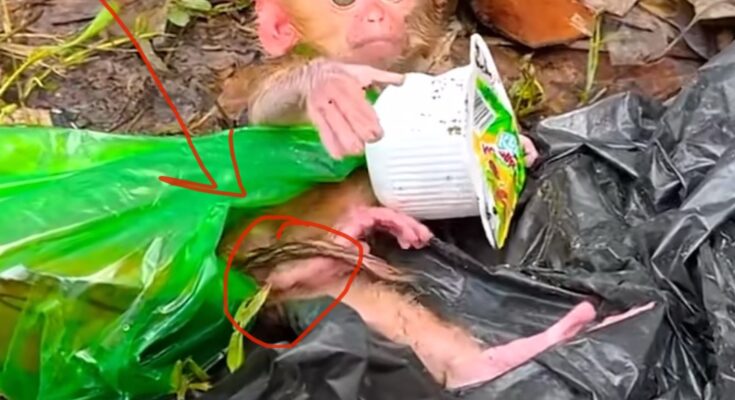 In a quiet corner of a crowded town, where piles of discarded waste stretch farther than the eye can see, an extraordinary and heartbreaking discovery was made. Amid the plastic bags, rotting food scraps, and broken debris, a tiny baby monkey lay trembling, weak from hunger and exhaustion. The little creature had apparently been trapped in the garbage dump for days, unnoticed by passersby and unable to escape the towering piles of waste surrounding it.