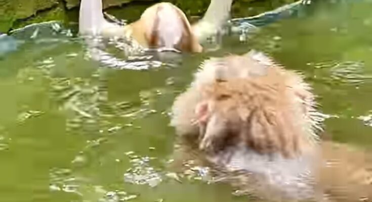Over time, the baby learned to paddle. It mimicked its mother’s movements, pushing water with its arms and legs. The mother would guide it to shallower spots, always nearby, always ready to help if it faltered. Within an hour, the fearful squeaks had turned into joyful chatter. The baby discovered that swimming wasn’t so scary after all—it was fun!