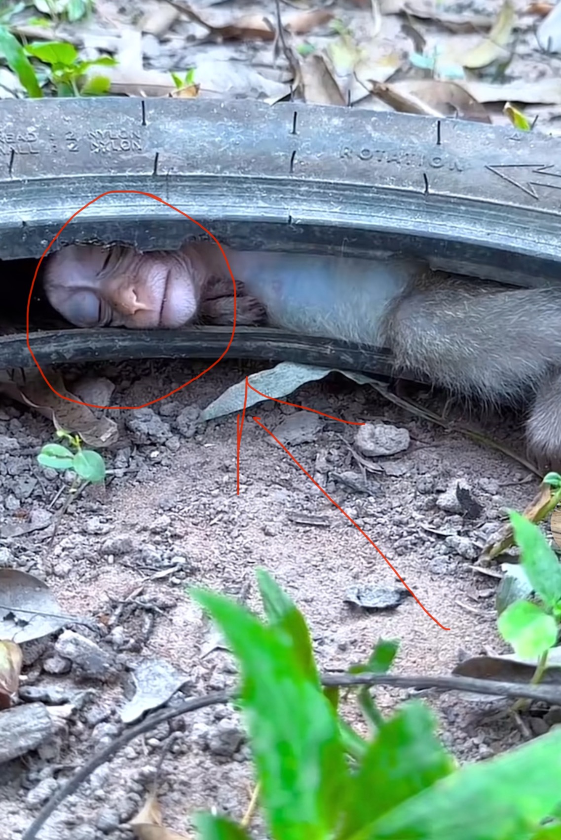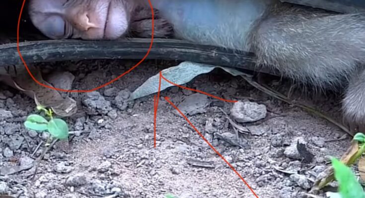 In a remote forested region on the outskirts of a Southeast Asian village, a heartbreaking and bizarre scene recently unfolded: a baby monkey was found helplessly trapped inside the rim of a discarded motorcycle tire — a cruel trap allegedly set by a poacher. The incident has sparked outrage among wildlife conservationists and raised serious concerns about the increasingly inhumane tactics used in the illegal wildlife trade.