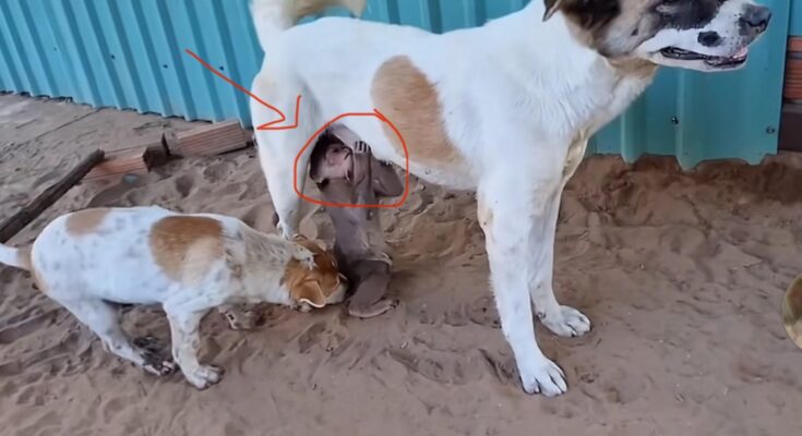 But just as the villagers were about to intervene, something incredible happened. A stray dog, well known in the area for roaming freely around the fields, slowly approached the monkey. Rather than harm or ignore the helpless animal, the dog did something no one expected — she gently picked up the baby monkey by the scruff of its neck, just as she would her own pup, and carried it away.
