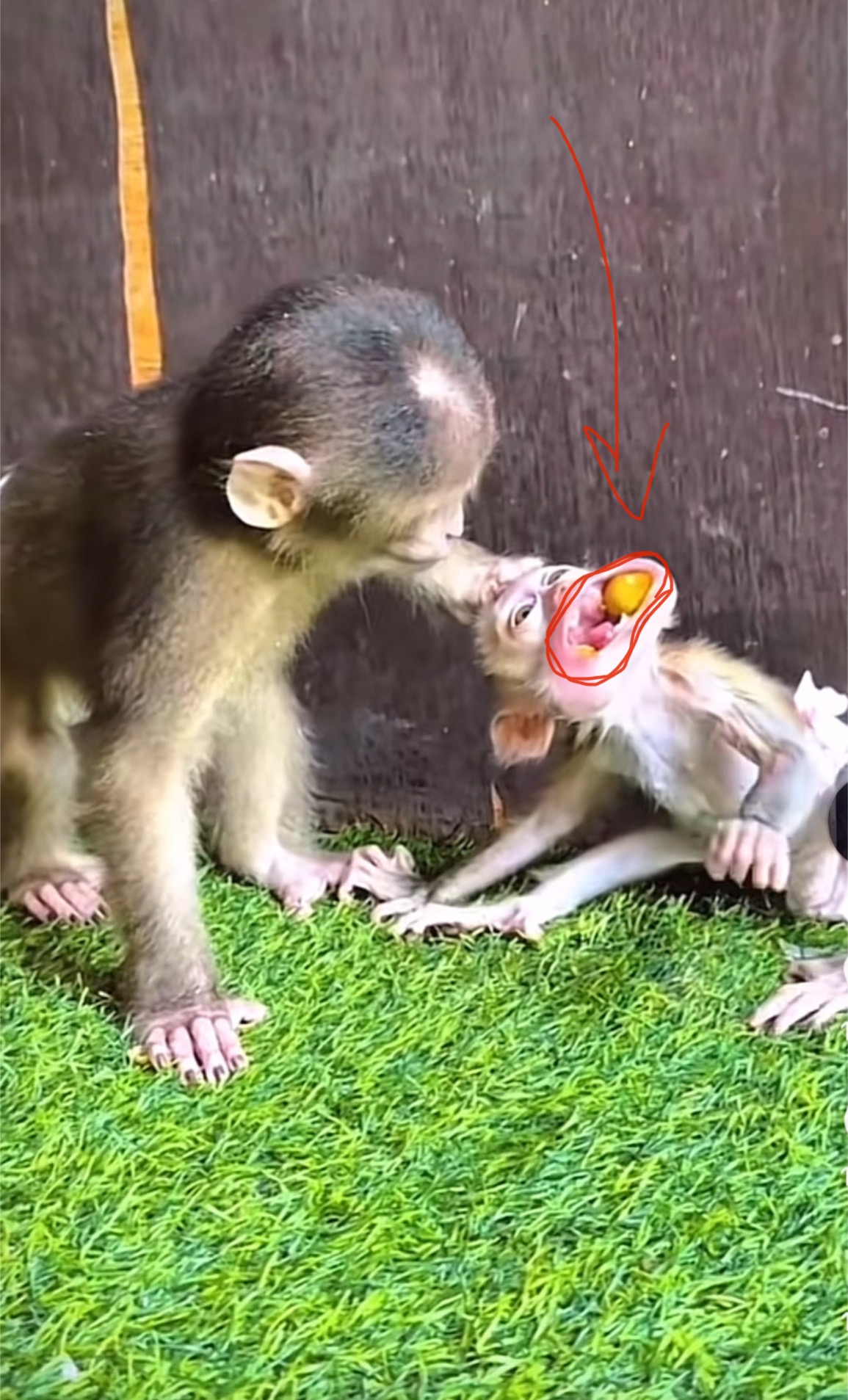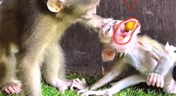 Hearing Tiko’s strange coughing and noticing his distress, Boro swung swiftly into action. He climbed to the branch where Tiko was perched and immediately recognized the seriousness of the situation. Without hesitation, Boro held the little monkey gently but firmly, turning him over slightly and giving several calculated thrusts to his back using both his strength and experience.
